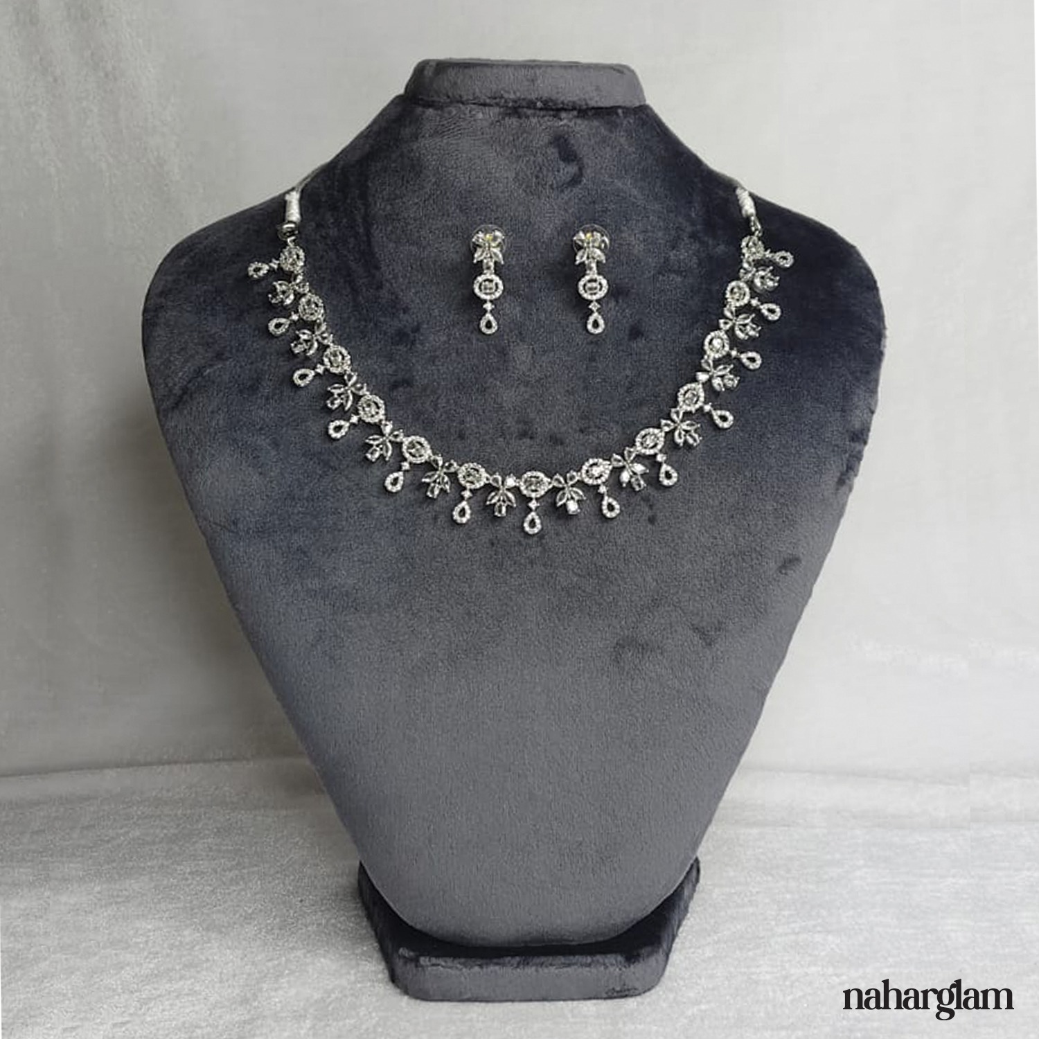 নেকলেসটির সূক্ষ্ম ফুল ও পান্নার মতো আকৃতির পাথরের নকশা একে আরও আকর্ষণীয় করে তুলেছে। দুলের নকশাটিও মিল রেখে তৈরি, যা আপনার সাজে সম্পূর্ণতা এনে দেবে।